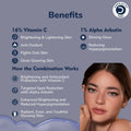 The synergy of 16% Vitamin C and 1% Alpha Arbutin is exceptionally potent for illuminating the skin, diminishing dark spots, addressing dullness, and harmonizing skin tone. These components collaborate to target pigmentation issues and bolster skin's glow and radiance: