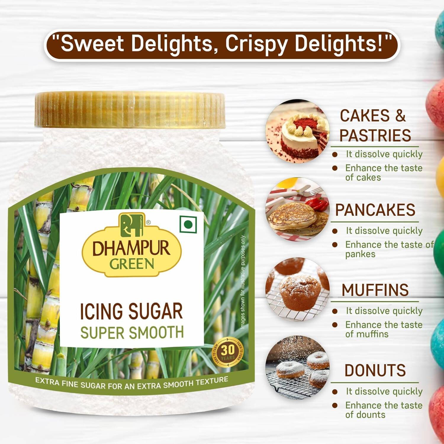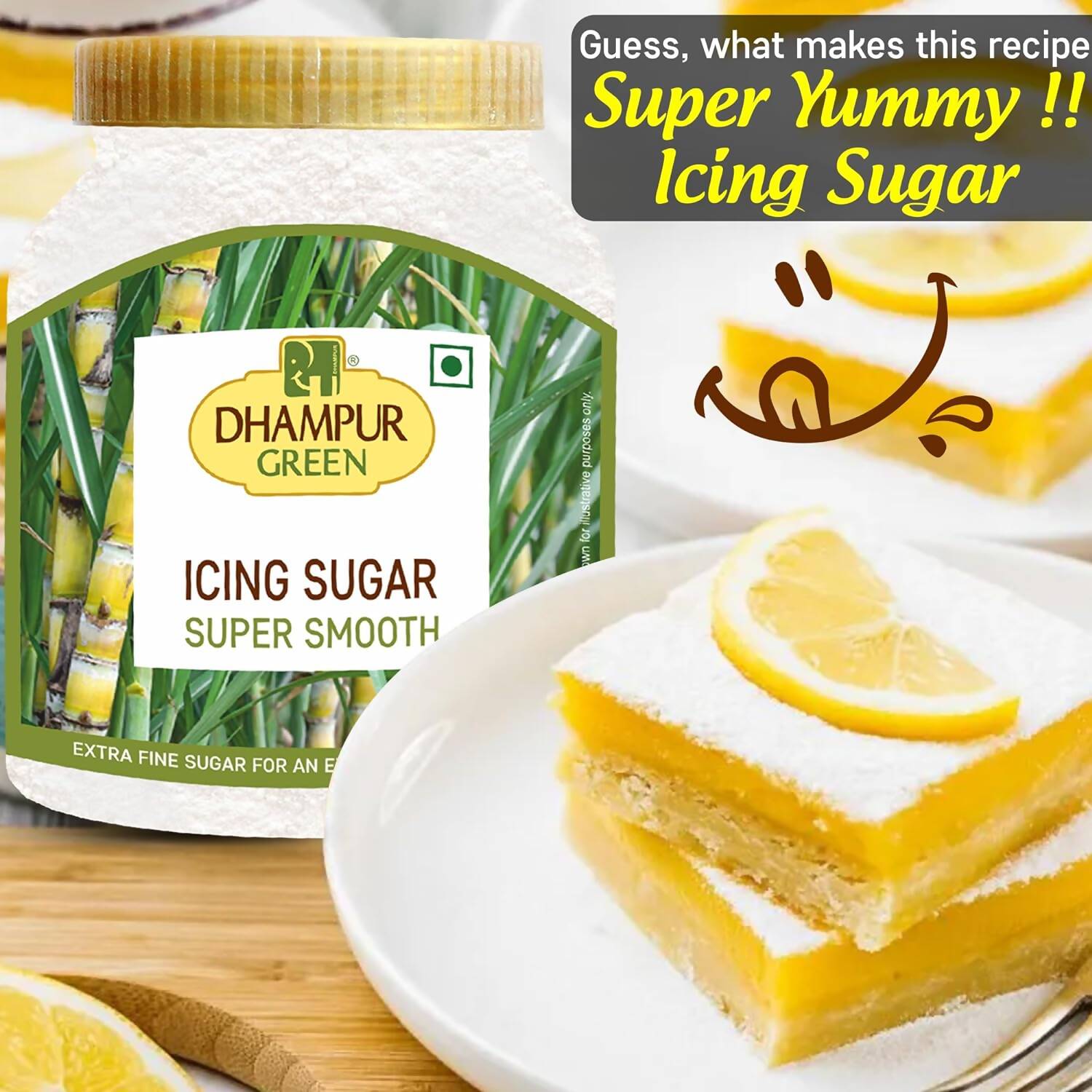 - Dhampur Green Icing Sugar undergoes micro-pulverization to achieve a fineness that is twice that of most other fine sugars. This ultra-fine grind ensures a velvety and smooth texture, making it perfect for royal icings and buttercream. Effortlessly blending in, it is also perfect for creating shortbread, cream fillings, marshmallows, frostings, silky fondants, glossy icings, and glazes, as well as for dusting over cakes and desserts for an elegant finish.