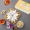 - Dhampur Green's Kaju Katli is a marvel of simplicity, crafted with just three carefully chosen ingredients to ensure outstanding flavor. The core of this delectable delight is the rich and creamy cashew nuts, comprising a generous 52% of its makeup. These cashews are selected for their superior quality, providing a velvety texture that is both sumptuous and luxurious.