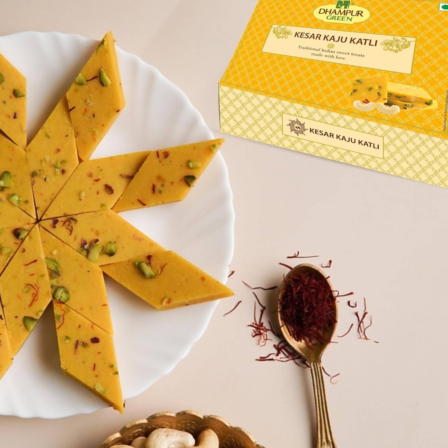 - Dhampur Green's Kesar Kaju Katli exemplifies the exquisite art of flavor harmony and the quest for excellence. At its heart are sumptuous cashew nuts, making up a substantial 52% of this delectable confection. These cashews are meticulously selected for their superior quality, ensuring a texture that is both rich and indulgent, offering a melt-in-your-mouth experience.