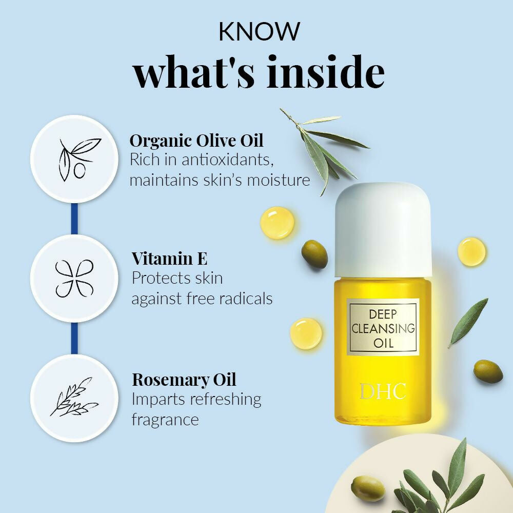 - A cult favorite, DHC Deep Cleansing Oil stands out as a unique product. With one unit sold every 10 seconds worldwide, this pioneering Japanese oil cleanser effortlessly removes makeup and eliminates impurities, leaving your skin cleansed, soft, and glowing. The formulation, based on 100% organic olive oil, operates on the scientific principle that "like dissolves like." When applied with dry hands to a dry face, this luxuriant, naturally golden olive oil-based cleanser binds with dirt and efficiently breaks down sunscreen, sebum, and persistent makeup, such as waterproof mascara and eyeliner, without clogging pores. The water-soluble formula washes away cleanly, leaving no oily residue. Its silky texture and subtle, natural rosemary scent transform face washing into a pampering spa-like ritual. This botanical blend features antioxidant-rich organic olive oil and vitamin E to hydrate, soften, and shield against free radical harm, while rosemary leaf oil invigorates and refreshes.