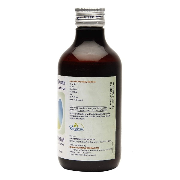 The Dhootapapeshwar Amla Pitta Mishran Suspension is composed of active ingredients such as Vasa 100 mg, Guduchi 100 mg, Pittapapada 100 mg, Nimba 100 mg, Chiraita 100 mg, Bhrungaraj 100 mg, Triphala 100 mg, Patol 100 mg, Yashtimadhu 100 mg, and Shouktik Bhasma 500 mg.