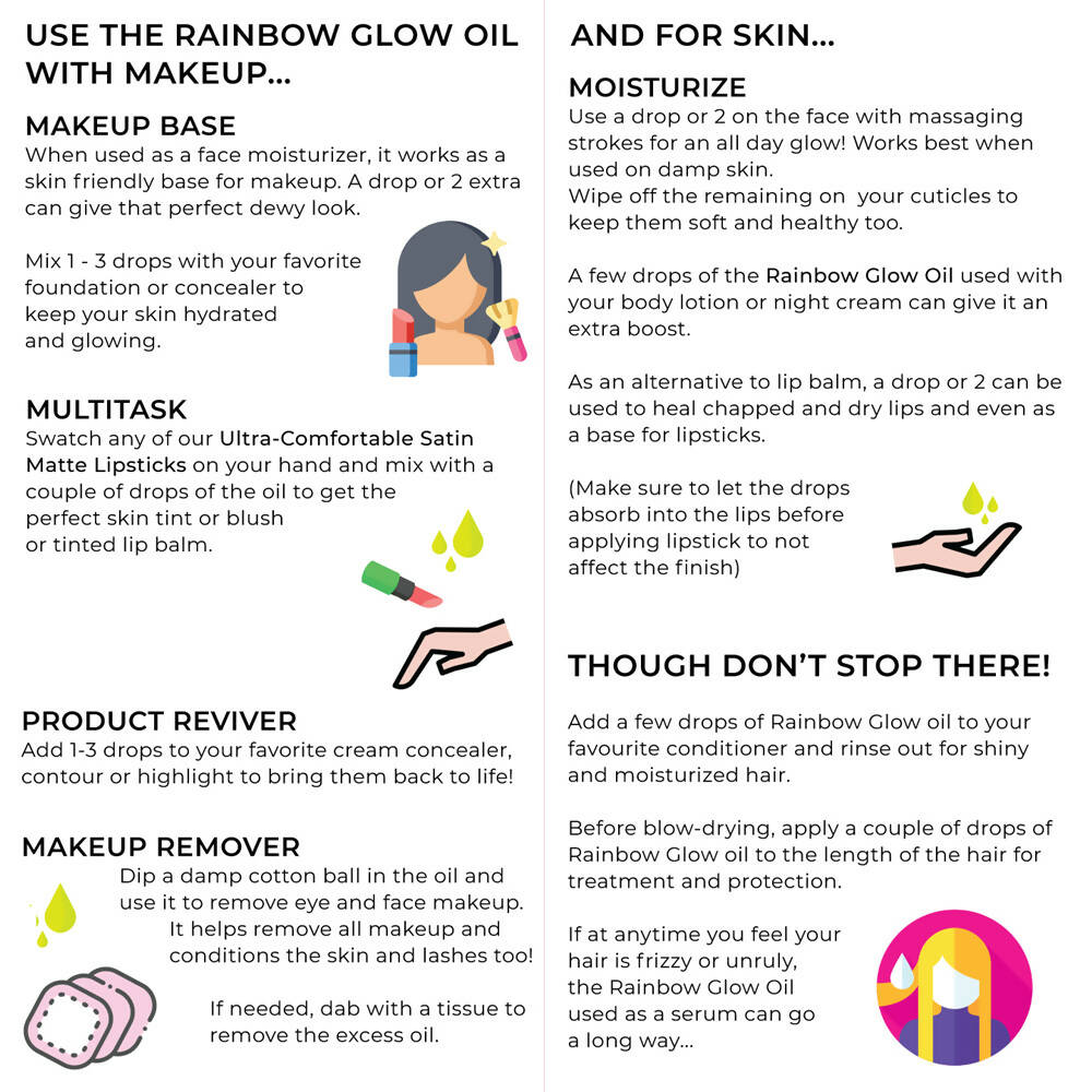 - Enhance your body lotion or night cream with a few drops of the Rainbow Glow Oil for an added boost.