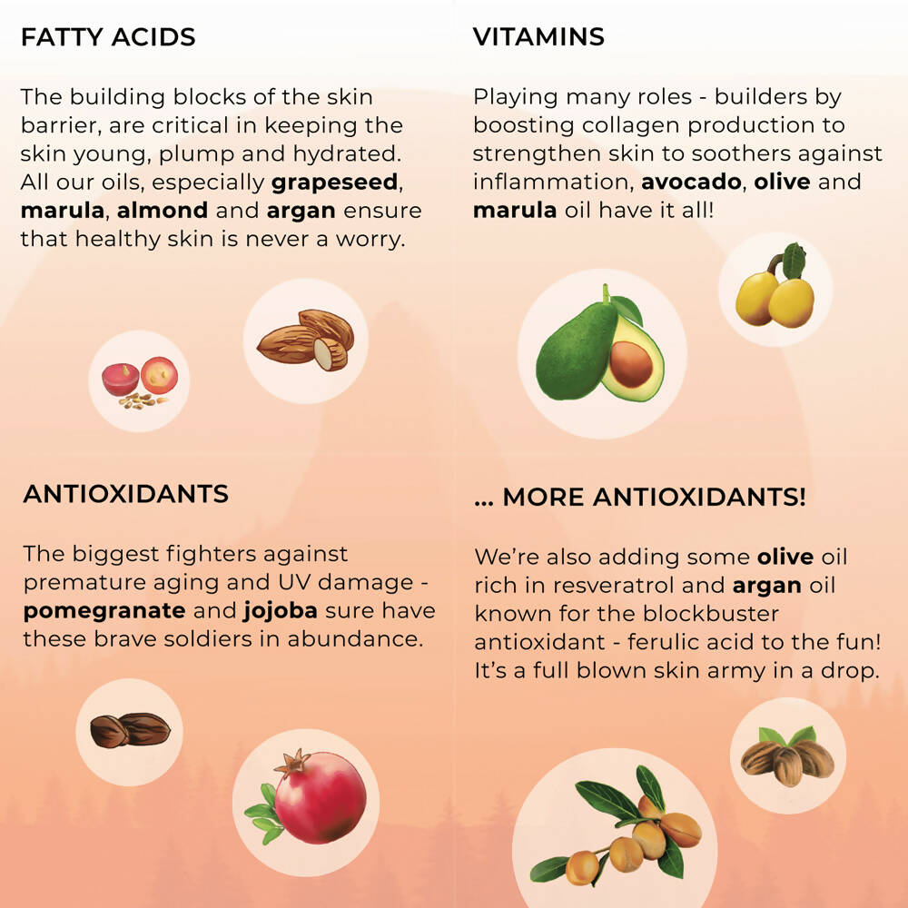 - Grapeseed oil, Isopropyl Myristate (derived from vegetables), Argan oil, Marula oil, Jojoba oil, Avocado oil, Apricot oil, Almond oil, Olive oil, Vitamin E, Pomegranate Extract, Fragrance.