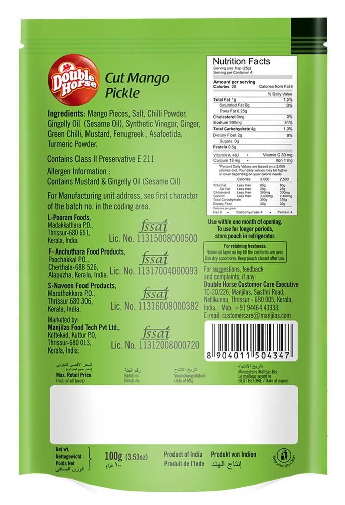 Ingredients:- Mango pieces, salt, chili powder, gingelly oil, mustard, fenugreek, ginger, green chili, synthetic vinegar, asafoetida, turmeric powder