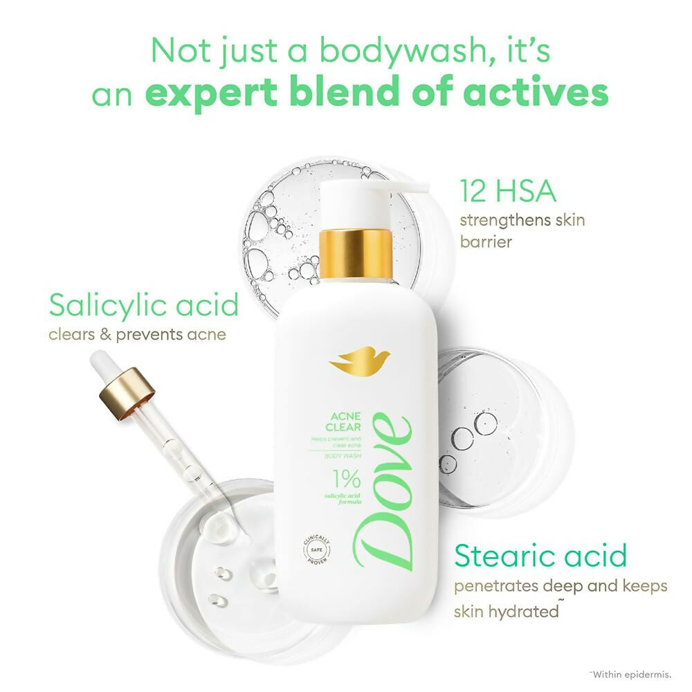About the product:- Struggling with body breakouts? Discover Dove Acne Clear Bodywash. Developed in collaboration with dermatologists, this invigorating gel body wash features a 1% salicylic acid clearing serum. It transforms into a rich, foamy lather with invigorating fresh and herbal fragrances to address body acne. Lather up for thoroughly cleansed skin, purify your pores, and prevent future acne breakouts. This Acne clearing bodywash introduces expert care into your shower routine by incorporating the active ingredients you already trust in your facial care regimen.