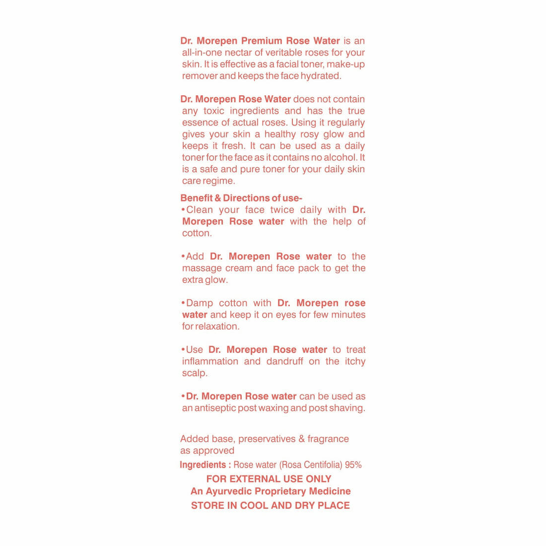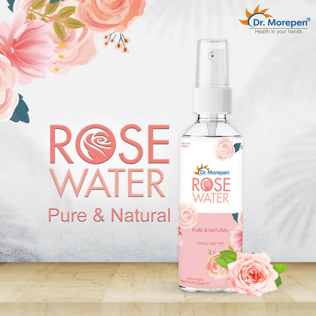- Dr. Morepen Rose water serves as a versatile elixir derived from genuine roses for your skin. It functions effectively as a facial toner, a make-up remover, and ensures skin remains moisturized. It is entirely herbal, embodying the authentic essence of actual roses. Consistent use will impart a healthy rosy radiance while preserving your skin's pH balance. Incorporate this alcohol-free toner into your daily skincare routine to revitalize your skin and diminish puffiness, redness, and inflammation caused by heat and environmental pollutants.