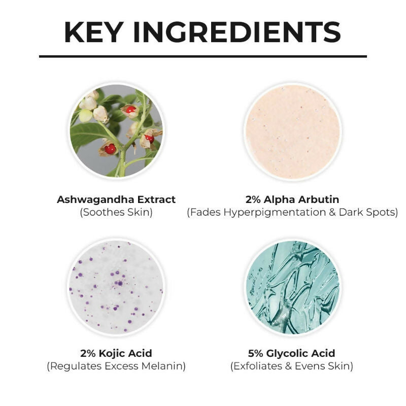 - To Mitigate Hyperpigmentation Targets Dark Spots Kojic Acid, A Robust Anti-Dark Spot Agent, Alongside Glycolic Acid, Effectively Manages Melanin Synthesis & Reduces Dark Spots Diminishes Discoloration For A Unified Skin Tone Powered By Potent De-Pigmenting Actives, This Formula Combats Uneven Skin Tone For A Noticeably Brighter Complexion