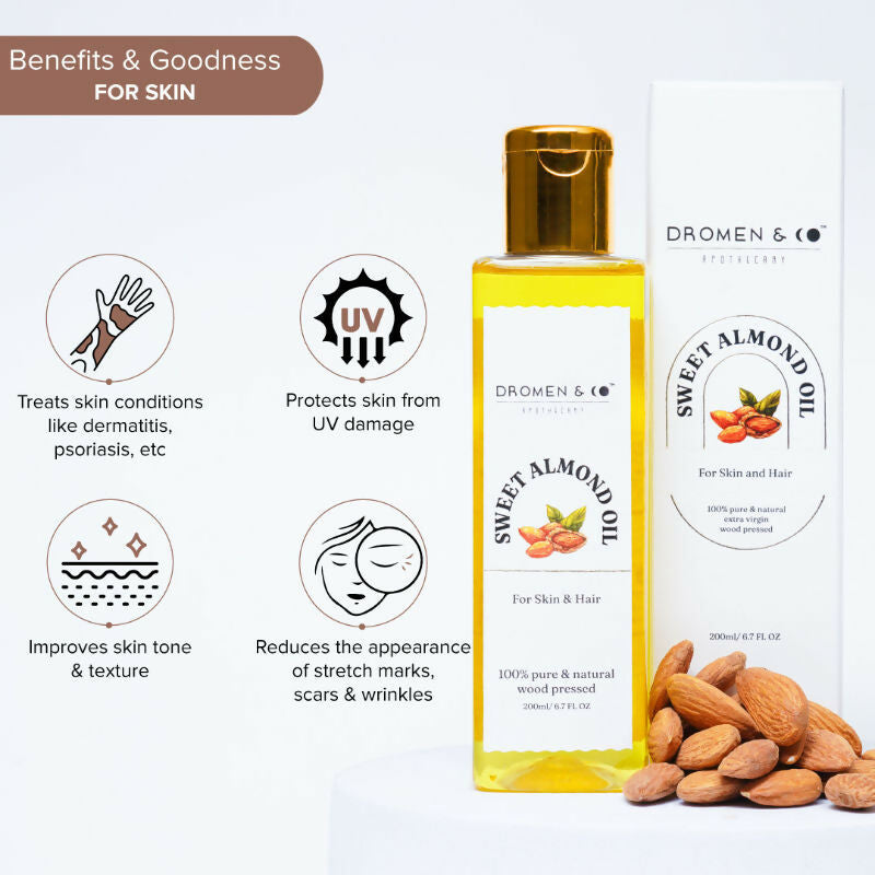 - Rich in antioxidants, vitamins, and nutrients, Dromen & Co's 100% pure and natural, wood-pressed Sweet Almond Oil is derived from various almond varieties, with Mamra almond as a standout ingredient. Sourced from Kashmir, it boasts high levels of calcium, potassium, zinc, and magnesium, with reduced saturated fat content.
