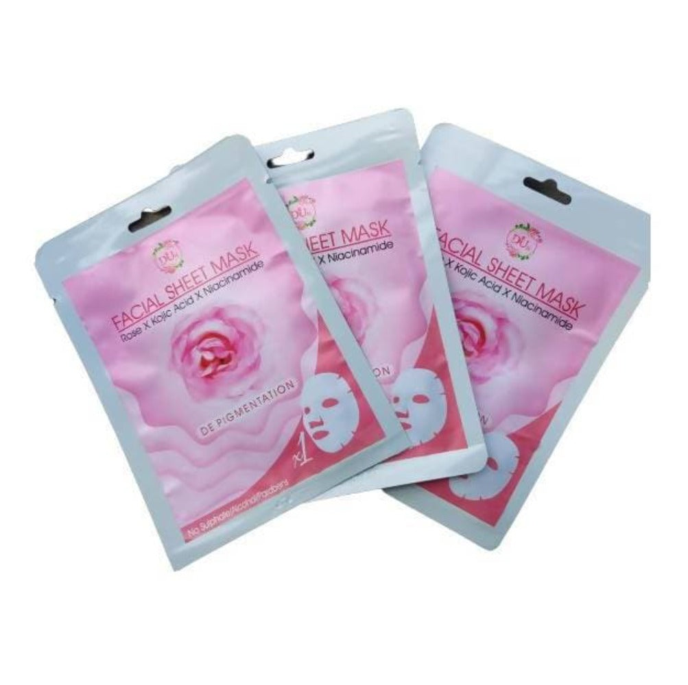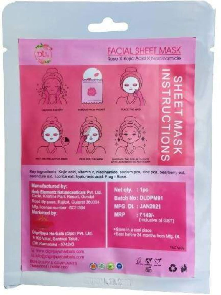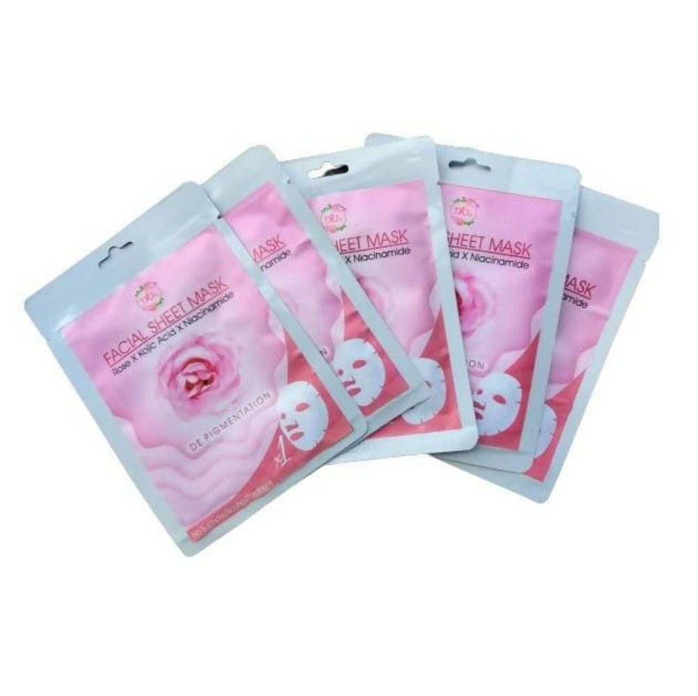 With goodness of Kojic acid, niacinamide,rose and rice water extracts , our facial sheet mask is soaked in rich serums to give your skin an extraordinary boost and to level up your skin care regime !