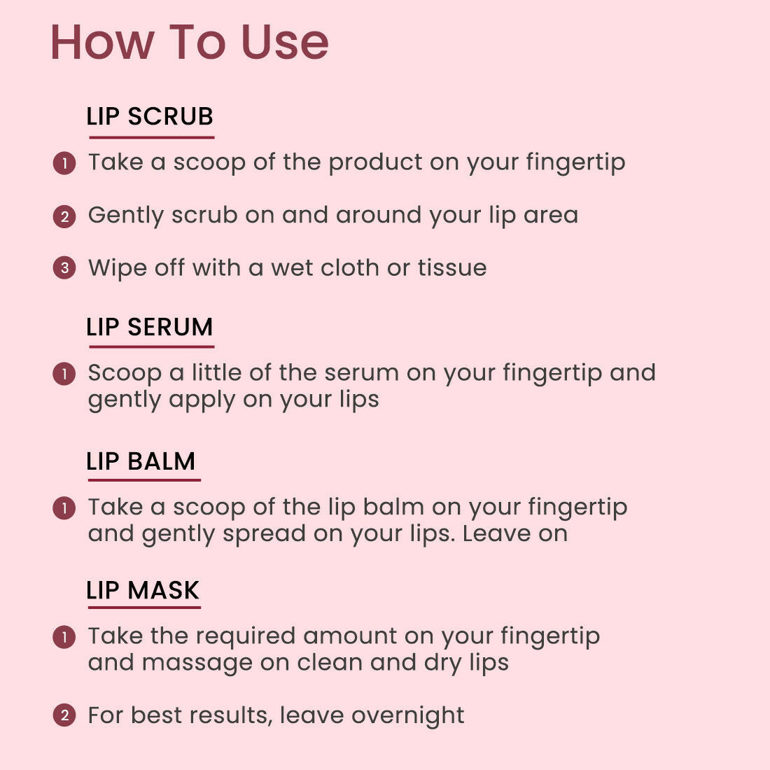 - Earth Rhythm Lip Scrub: Gently massage the lip scrub in circular motions on your lips, then rinse off for smooth, soft lips.