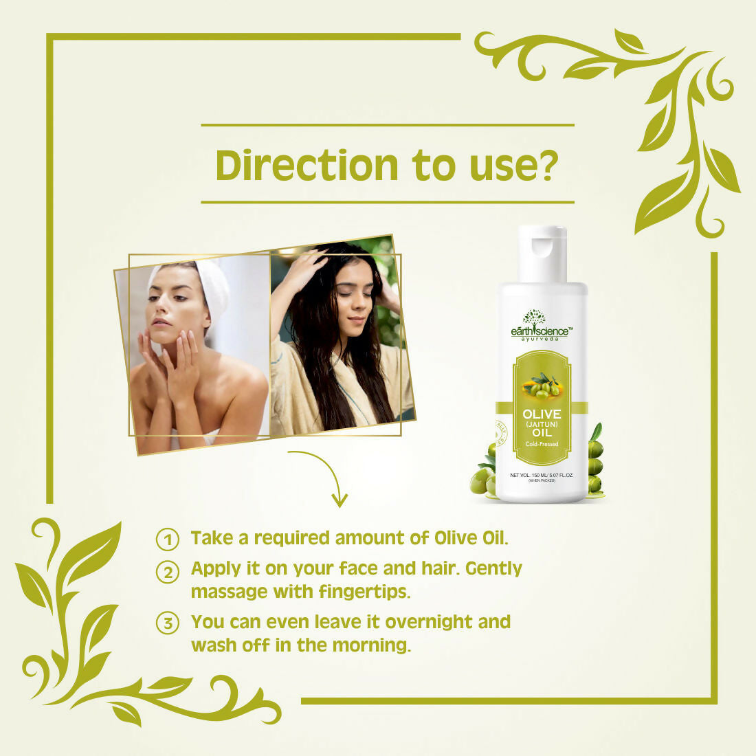 Earth Science Ayurveda 100% Pure Olive Oil Cold Pressed is a multipurpose oil ideal for both skin and hair care. Here's how you can utilize it efficiently: