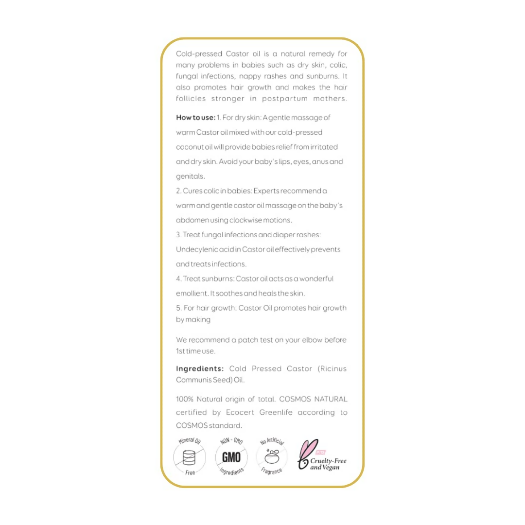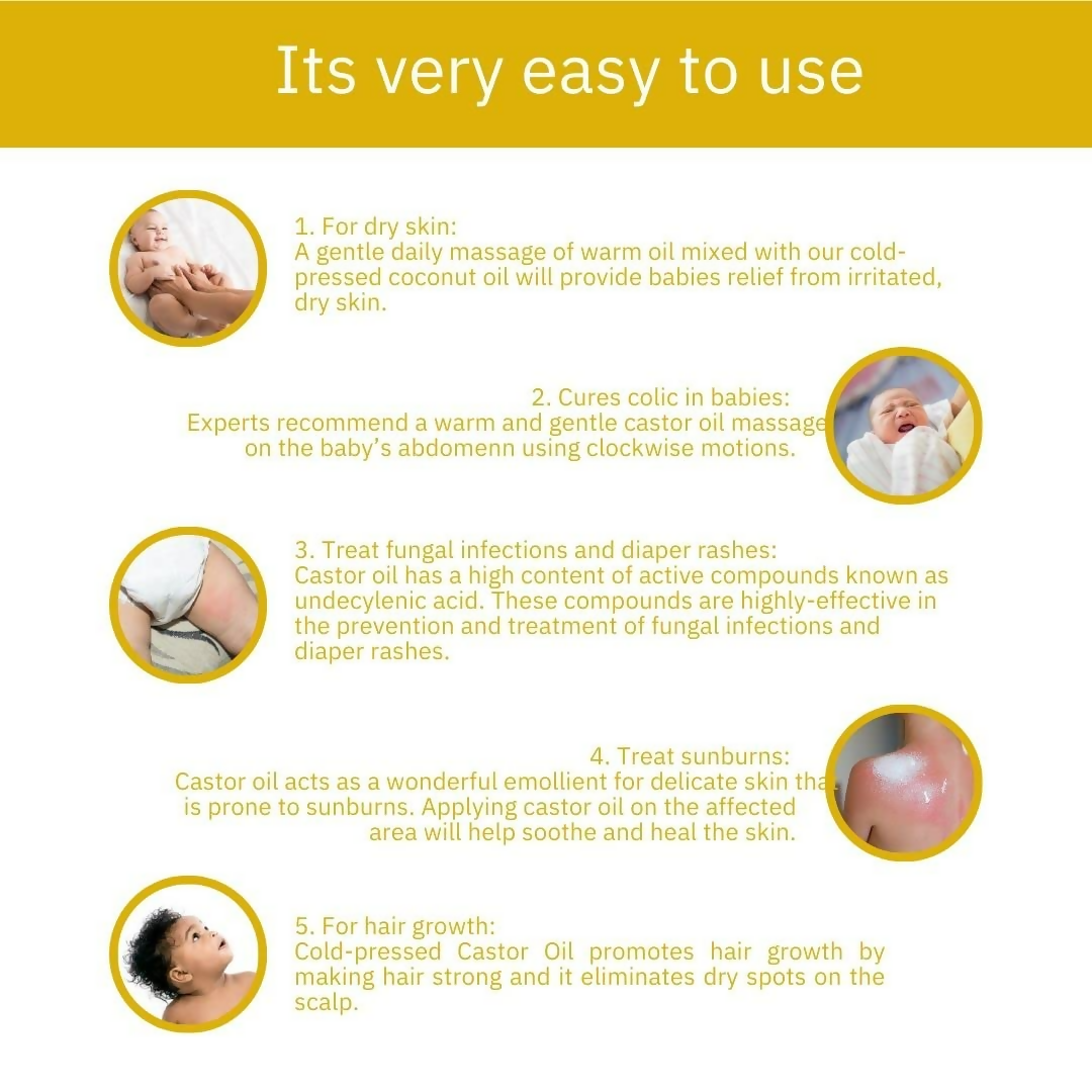 1. For dry skin: A gentle daily massage with warm oil mixed equally with our cold-pressed coconut oil can offer babies relief from irritated, dry skin. Avoid applying castor oil near your baby’s lips, eyes, anus, and genitals.