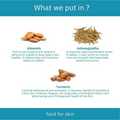 - Almond, Ashwagandha, Moringa Oils, Manjishtha, Turmeric & Saffron, Coconut and Sesame Oil