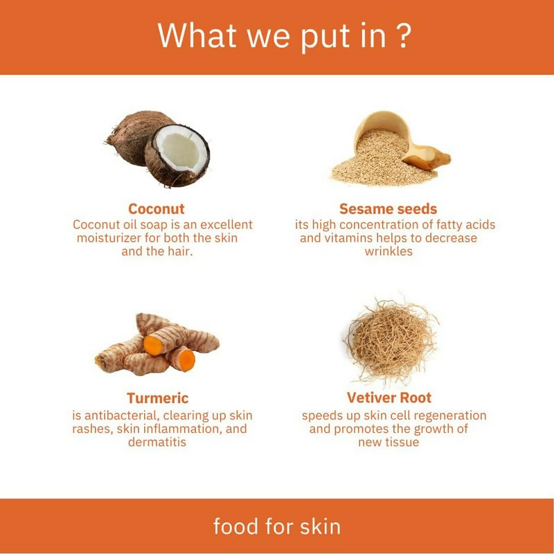 - Saponified Cold Pressed Edible oils of Cocos Nucifera (Coconut), Sesamum Indicum (Sesame), Ricinus Communis (Castor) seed; Desi-Cow milk, Rain-water, Curcumin Longa (Turmeric) root oil and Sandalwood oil.