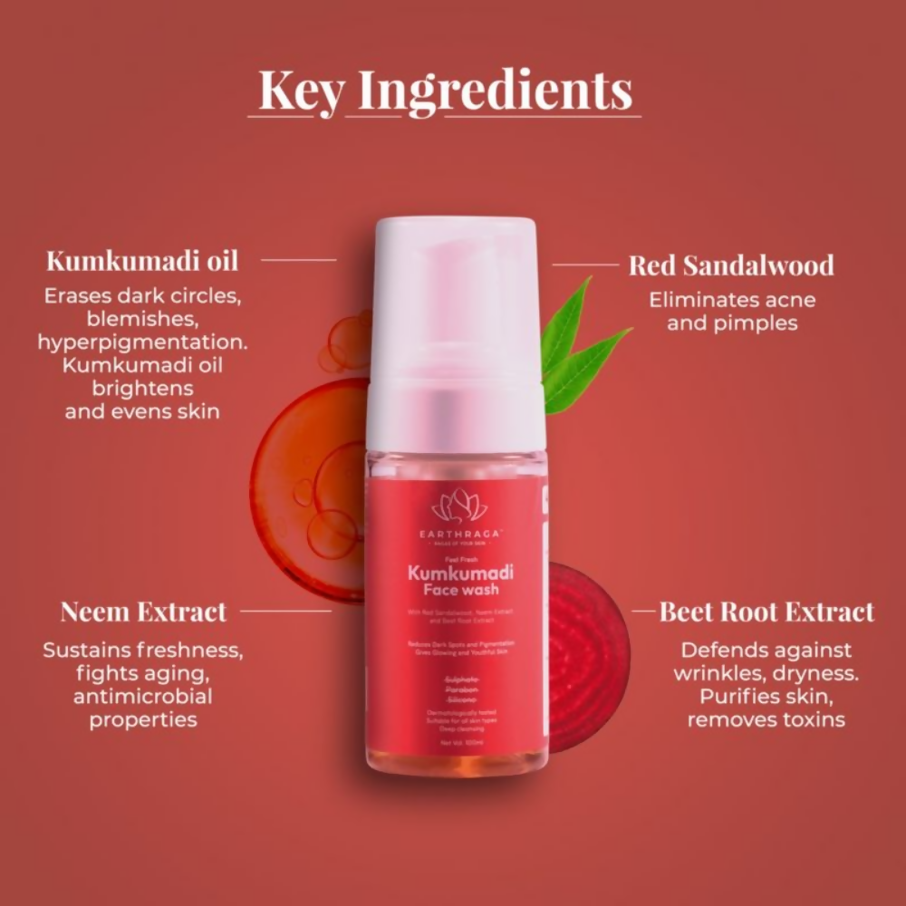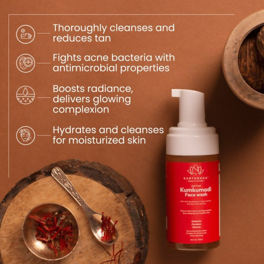 Experience the Earthraga Feel Fresh Kumkumadi Foam Face Wash, an ideal selection for your daily skincare regimen. Its potent blend of ingredients effectively purifies dirt and impurities, imparting a luminous glow to your complexion following each wash. Regular application ensures a revitalized, youthful visage with enhanced clarity and luminosity.
