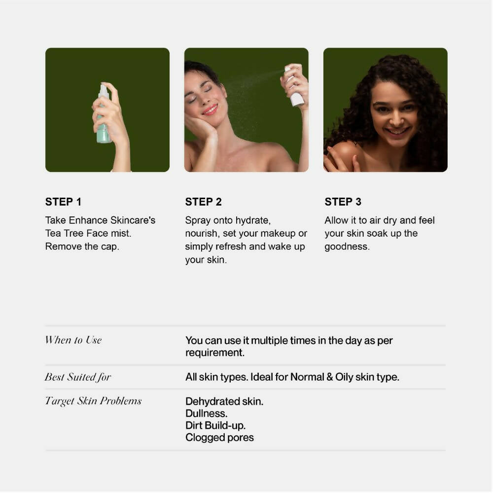 About the Product:- This daily, mild exfoliating toner helps to balance pH levels and rejuvenates your skin for a refreshing hydration boost. Our Tea Tree Face Mist instantly revives your complexion from the effects of heat, pollution, and dust. It thoroughly purifies the skin by eliminating impurities and prevents pimples, acne, and blemishes.