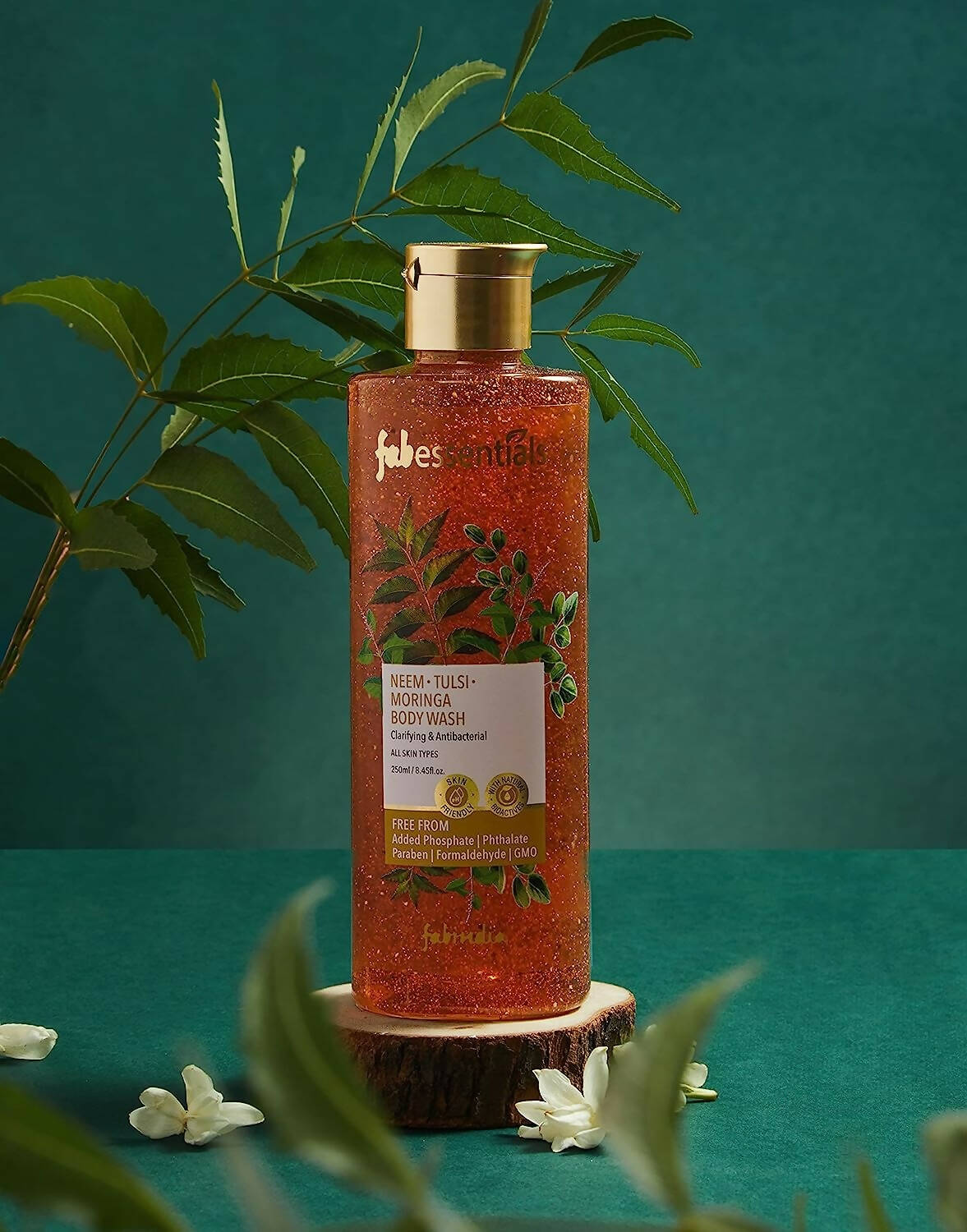 About the product:Fabessentials Neem Tulsi Moringa Body Wash features a remarkable blend of Neem, Tulsi, and Moringa extracts, enhanced with Walnut shell scrub particles that softly exfoliate impurities and dead skin cells from your skin. The natural bioactives in this body wash possess antibacterial and antifungal qualities, aiding in the protection of the skin against breakouts and irritation while gently eliminating excess oiliness. Invigorate your skin each morning or unwind after a busy day with this refreshing body wash.