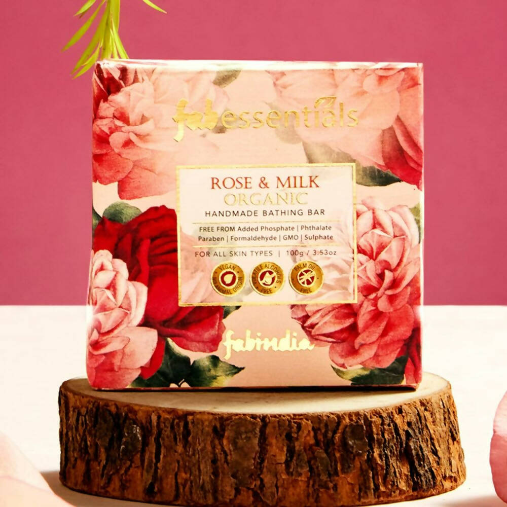 About the product:Fabessentials Rose & Milk Organic Handmade Bathing Bar purifies the skin with a gentle lather. The blend of rose and goat's milk offers a sumptuous, floral, and silky sensation. Goat's milk is known for soothing sensitive skin, while rose is particularly effective in retaining the skin's moisture.