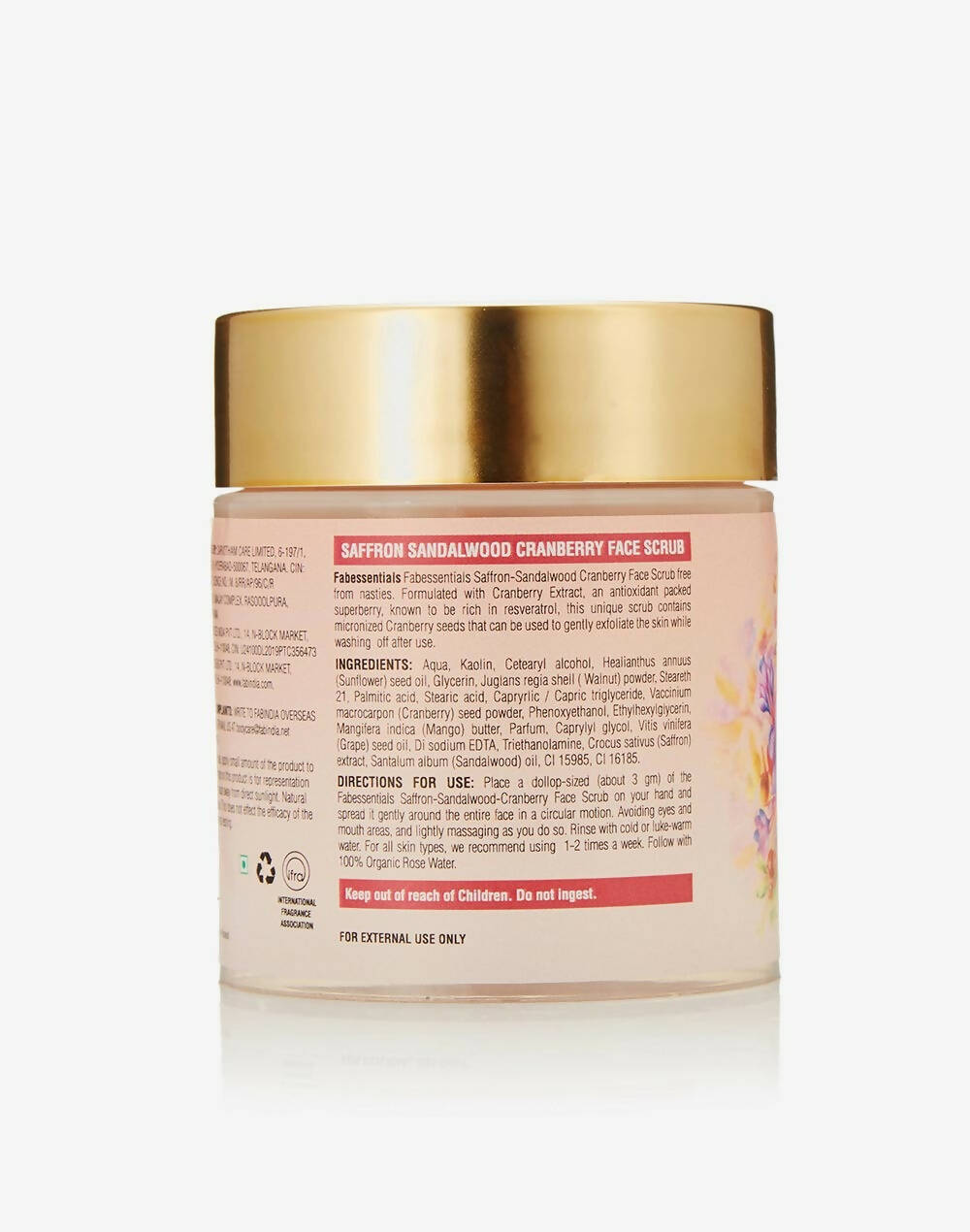 - Experience the purity of the Fabessentials Saffron Sandalwood Cranberry Face Scrub, crafted without harsh additives. Enriched with Cranberry Extract, a super berry loaded with antioxidants like resveratrol, this distinctive scrub incorporates micronized Cranberry seeds, ideal for gently exfoliating your skin as you rinse.