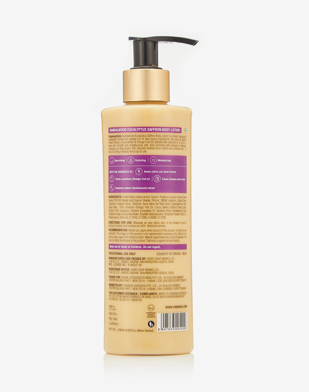 - Discover the Fabessentials Sandalwood Eucalyptus Saffron Body Wash, a soft, creamy foaming cleanser that invigorates your senses with the fragrant essence of Sandalwood and Eucalyptus. Perfect for energizing starts or refreshing ends to your day, this body wash is infused with Eucalyptus Oil and Saffron Flower Extract to purify and refresh without stripping your skin of moisture. It offers an exquisite showering experience, enriched with Orange Fruit Oil, known for its antioxidant properties, and calming Sandalwood to guard against free-radical harm. This formula also softens and moisturizes, helping your skin maintain its natural hydration, delivering a pampering, calming, and purifying shower ritual.