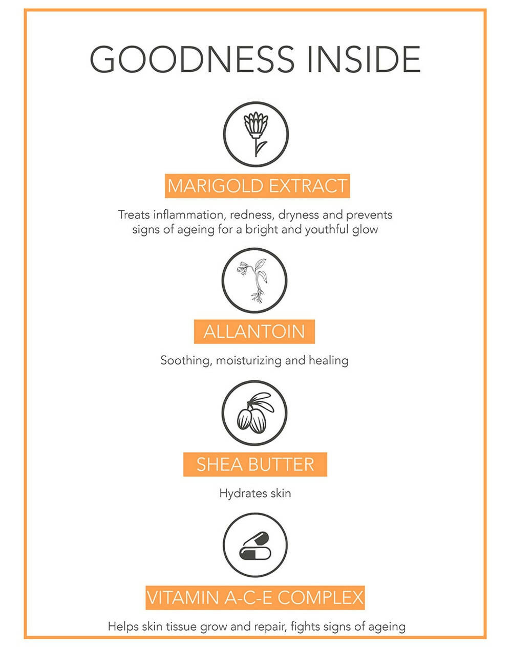 - Fabessentials Vitamin E Calendula Depigmentation Cream, enriched with the A-C-E complex, effectively combats signs of photo-aging and maintains skin's firmness, elasticity, and moisture. Crafted with Shea butter and Allantoin, this blend helps diminish excess pigmentation such as dark spots, blemishes, persistent tanning, dullness, and uneven skin tone to illuminate and even out the complexion.