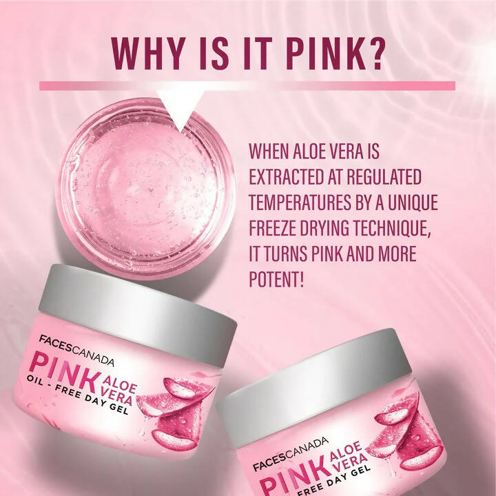 - Introducing Pink Aloe Vera in India for the first time, redefining hydration. Faces Canada Pink Aloe Vera Oil-Free Day Gel is crafted with exclusive 'Pink Aloe Vera', which offers greater potency than traditional green aloe vera. It also includes an innovative 1.5% Hyaluronic acid in its formulation!