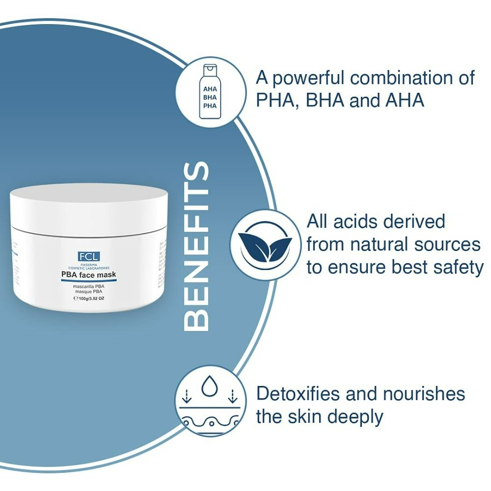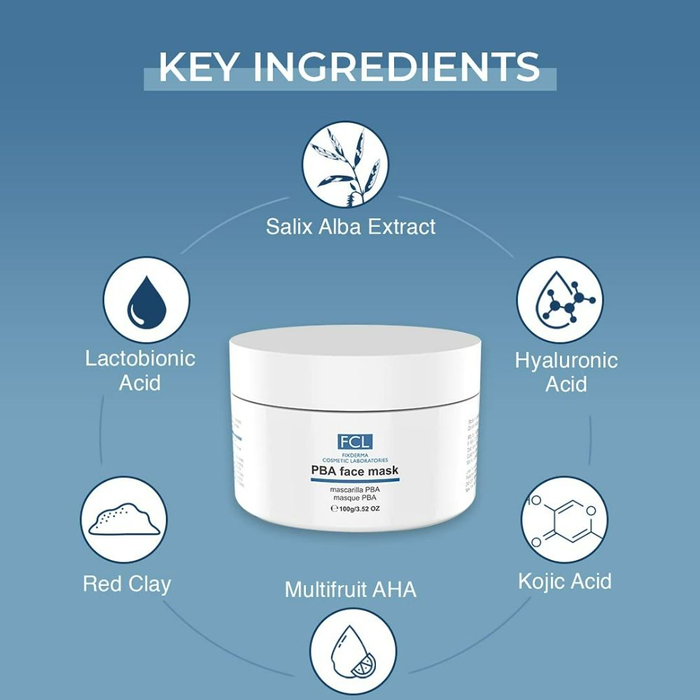 The Fixderma PBA Face Mask rejuvenates your skin with an opulent mixture of salix alba extract, red clay, kojic acid, hyaluronic acid, lactobionic acid, and multifruit AHAs. Salix alba extract enhances skin elasticity and diminishes wrinkles. Lactobionic acid and multifruit AHAs are powerful agents that shield against free radicals, helping to preserve a youthful appearance.