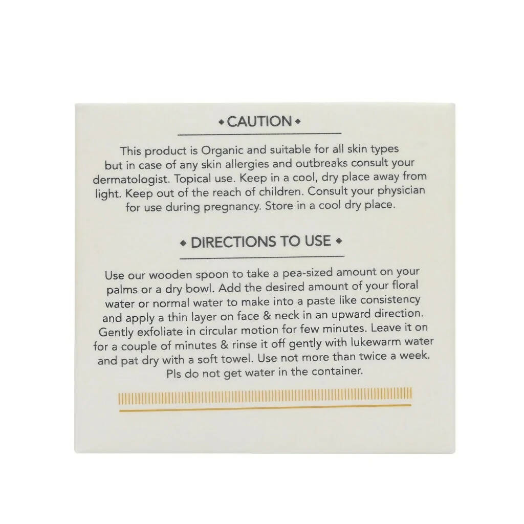 - Add the desired amount of your floral water or normal water to make into a paste like consistency and apply a thin layer on face & neck in an upward direction. Gently exfoliate in circular motion for few minutes.