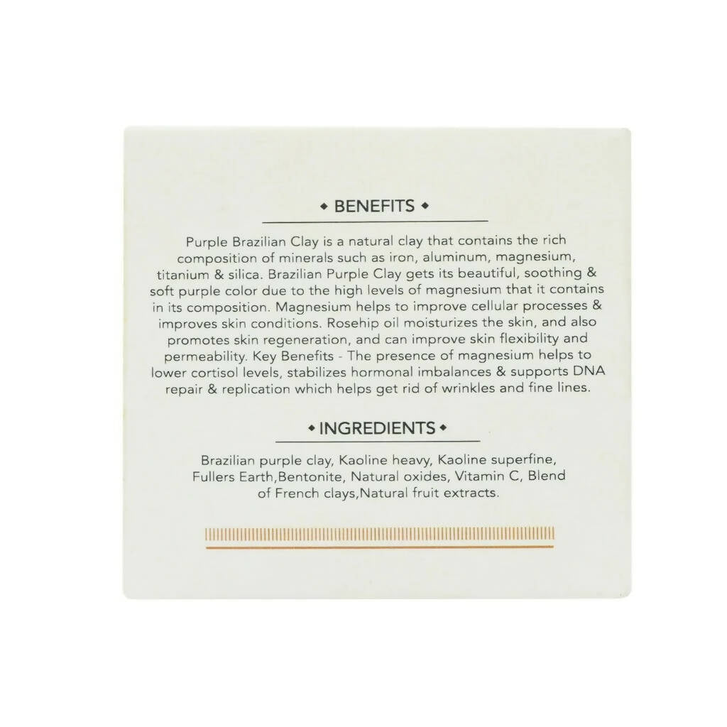 - The Brazilian Purple Clay is renowned for its charming, calming, and gentle purple hue. Rosehip oil hydrates the skin while enhancing its suppleness and permeability.