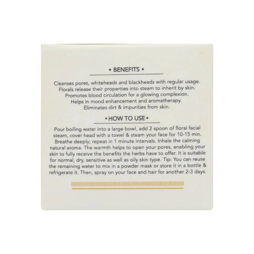 - Pour boiling water into a spacious bowl, add 2 spoons of floral facial steam, drape a towel over your head, and steam your face for 10-15 minutes. Inhale deeply; repeat at one-minute intervals. Experience the soothing natural fragrance. The heat aids in opening your pores, allowing your skin to fully absorb the herbs' benefits. Suitable for normal, dry, sensitive, as well as oily skin types.