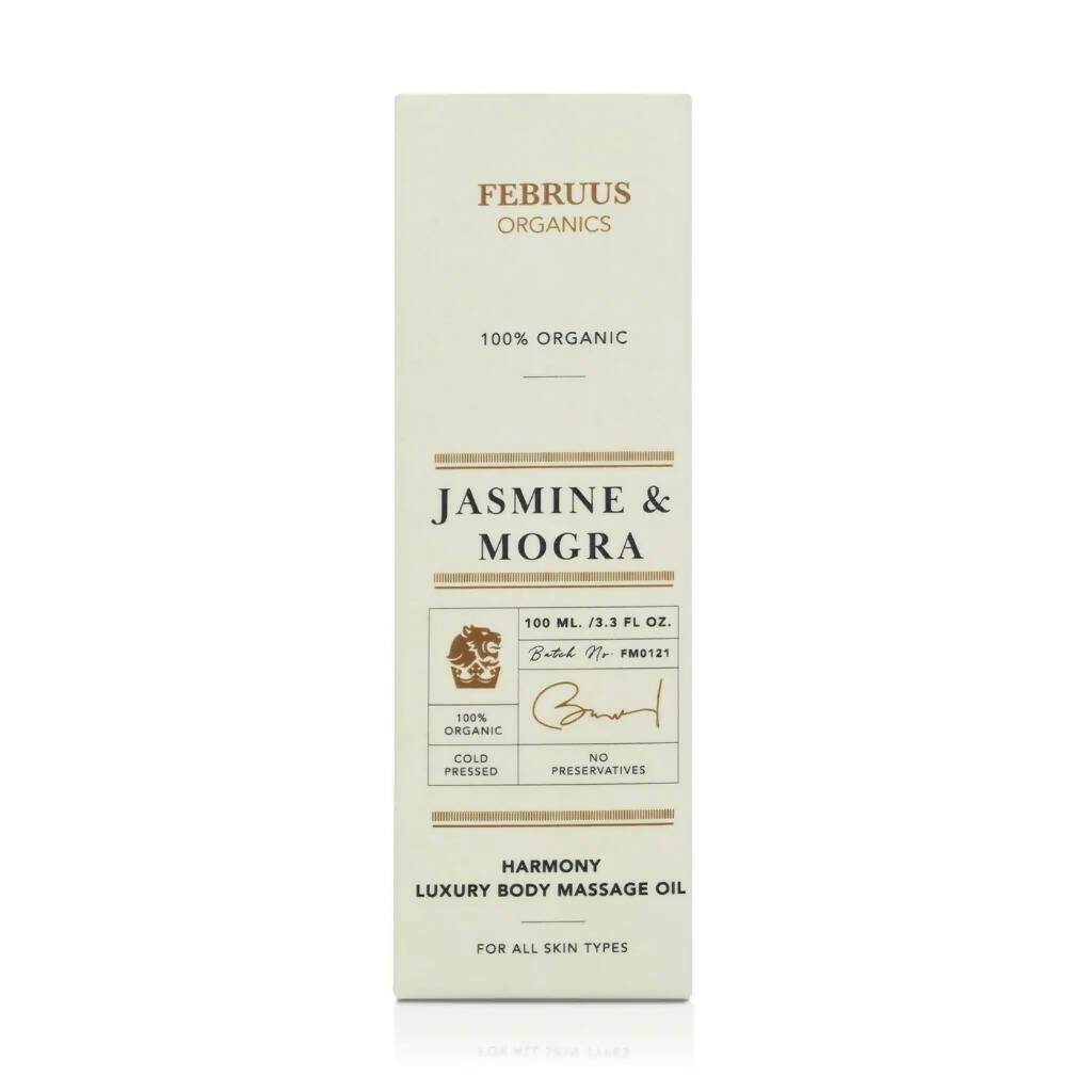 - Februus Harmony Body Massage Oil Jasmine & Mogra is crafted using a time-honored blend, renowned for its ability to firm, tone, and soften the skin. This luxurious oil is infused with a mixture of 100% freshly pressed, organic unrefined Black Sesame, Almond, Jojoba, and Grapeseed oils, coupled with potent herbs to deeply nourish the skin. Infused with the enticing aroma of Jasmine & Mogra, this massage oil harmonizes the senses, easing both mind and body tensions. With consistent use, it enhances the skin's radiance while imparting a subtle fragrance.