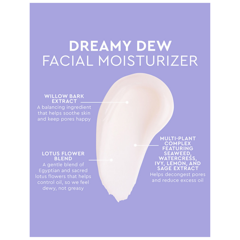 - This ultra-lightweight, hydrating, oil-free cream envelops your skin with a delightful sensation that you'll adore. Its smooth formula is enriched with dual lotus flower extracts and vitamin B12, assisting in oil regulation and soothing the skin. Willow bark contributes to maintaining a smooth complexion. When applied morning and night, Dreamy Dew leaves the skin feeling fresh and ready for the next steps in your routine.