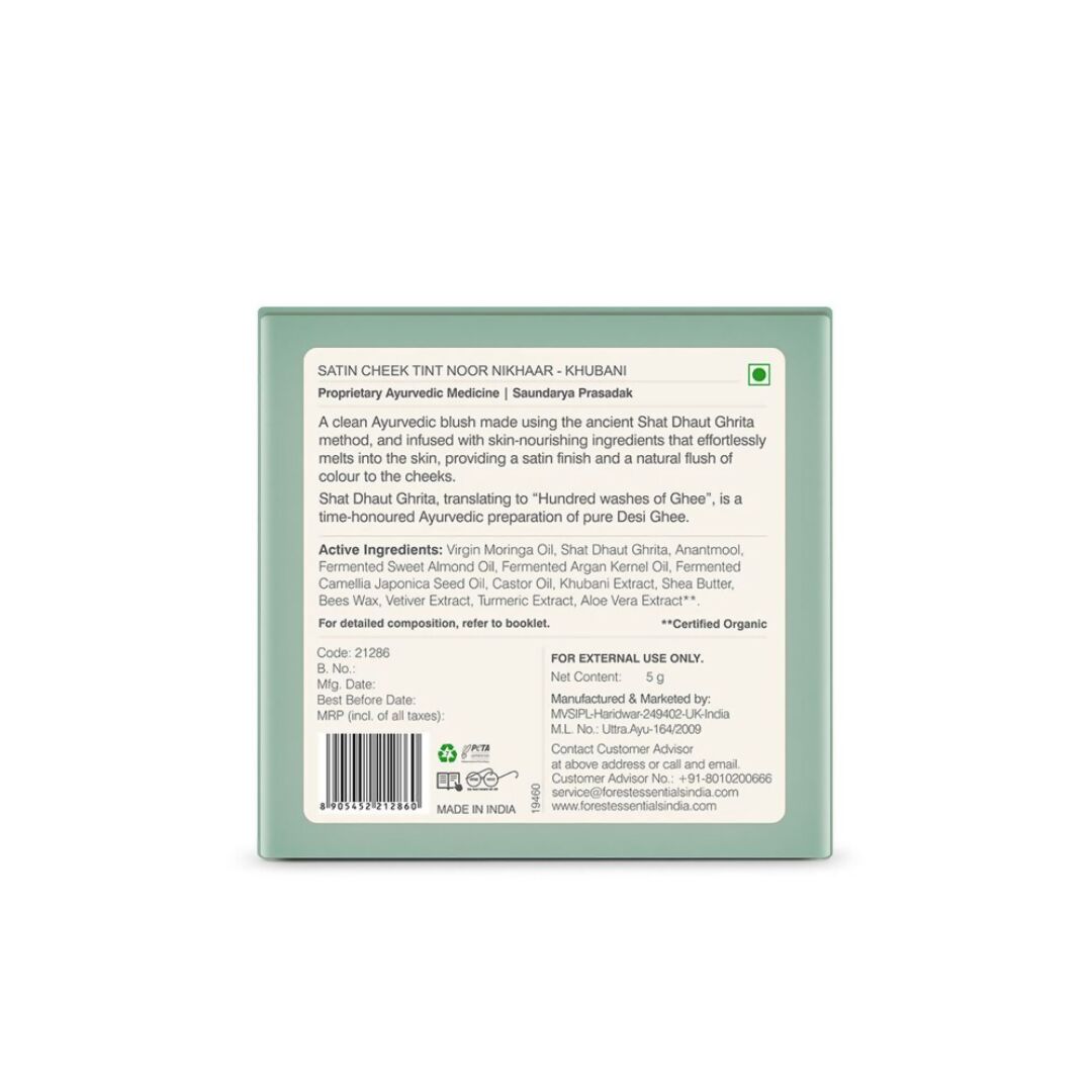 - The Khubani Noor Nikhaar Satin Cheek Tint is a vibrantly pigmented cream blush in an enchanting peach hue. Crafted using the time-honored Ayurvedic method of Shat Dhaut Ghrita, meaning ‘hundred washes of ghee’, this blush is infused with skin-nourishing elements, ensuring a flawless application and imparting a natural flush to your cheeks.