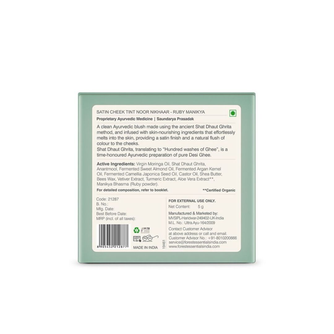 - The Manikya Noor Nikhaar Satin Cheek Tint is a lavishly colored cream blush in a majestic ruby hue. Crafted using the traditional Ayurvedic method of Shat Dhaut Ghrita, meaning ‘hundred washes of ghee’, this blush is formulated with skin-loving components that blend effortlessly, delivering a silky finish and a natural glow to the cheeks.