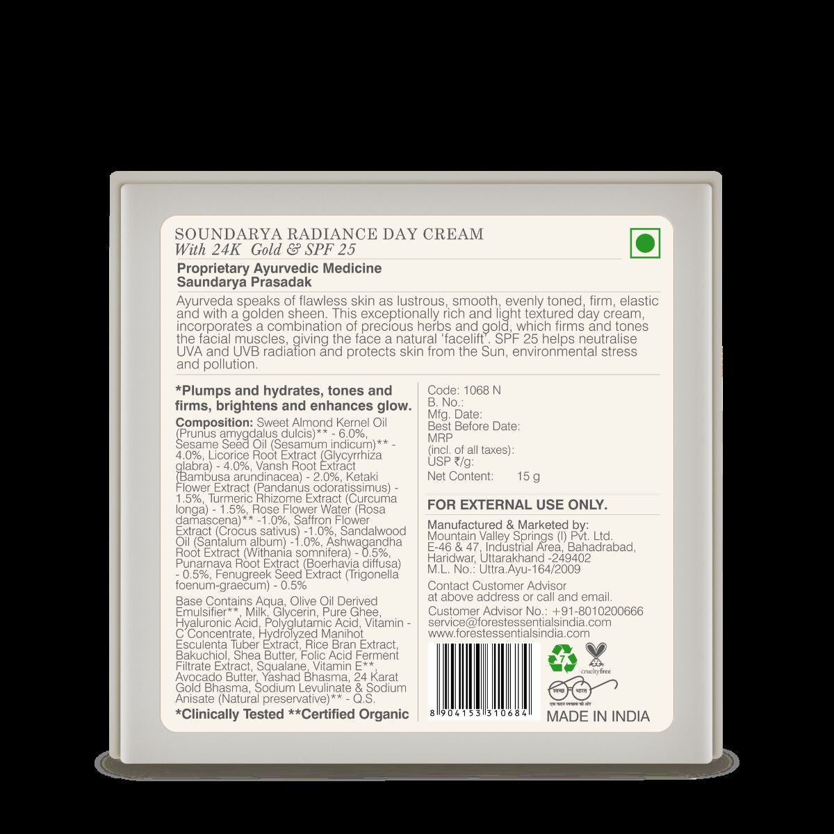- The Soundarya Radiance Cream With 24K Gold & SPF25 is a remarkably opulent yet light facial cream, composed of valuable herbs and genuine 24 Karat Gold. It aids in revitalizing skin firmness, providing a natural lift. This facial moisturizer includes a natural SPF 25, which effectively combats UVA and UVB rays, safeguarding the skin from solar harm, environmental factors, and pollutants.