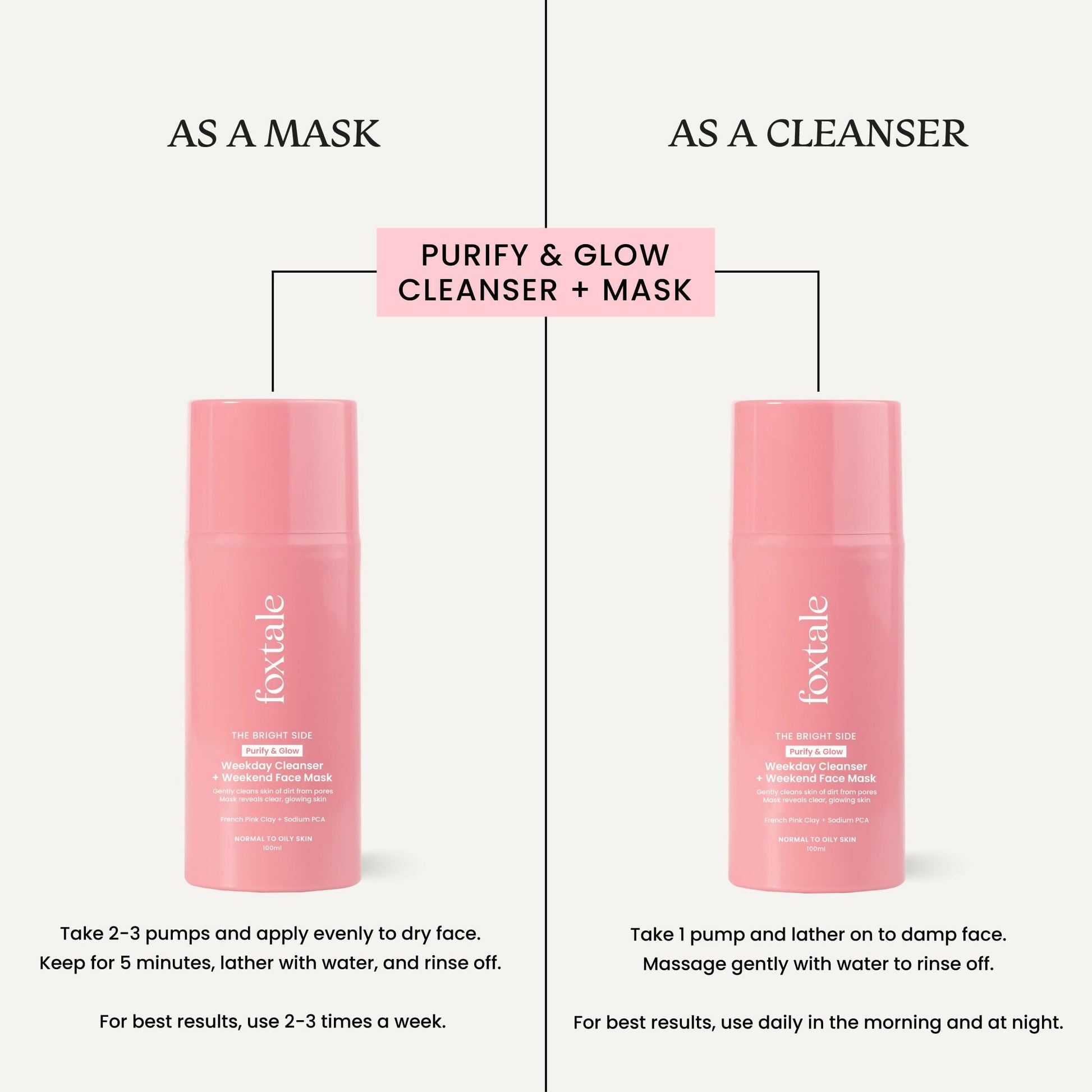 - As a mask: Dispense 2-3 pumps and apply evenly to a dry face. Leave for 5 minutes, then lather with water and rinse off. For optimal results, use 2-3 times a week.