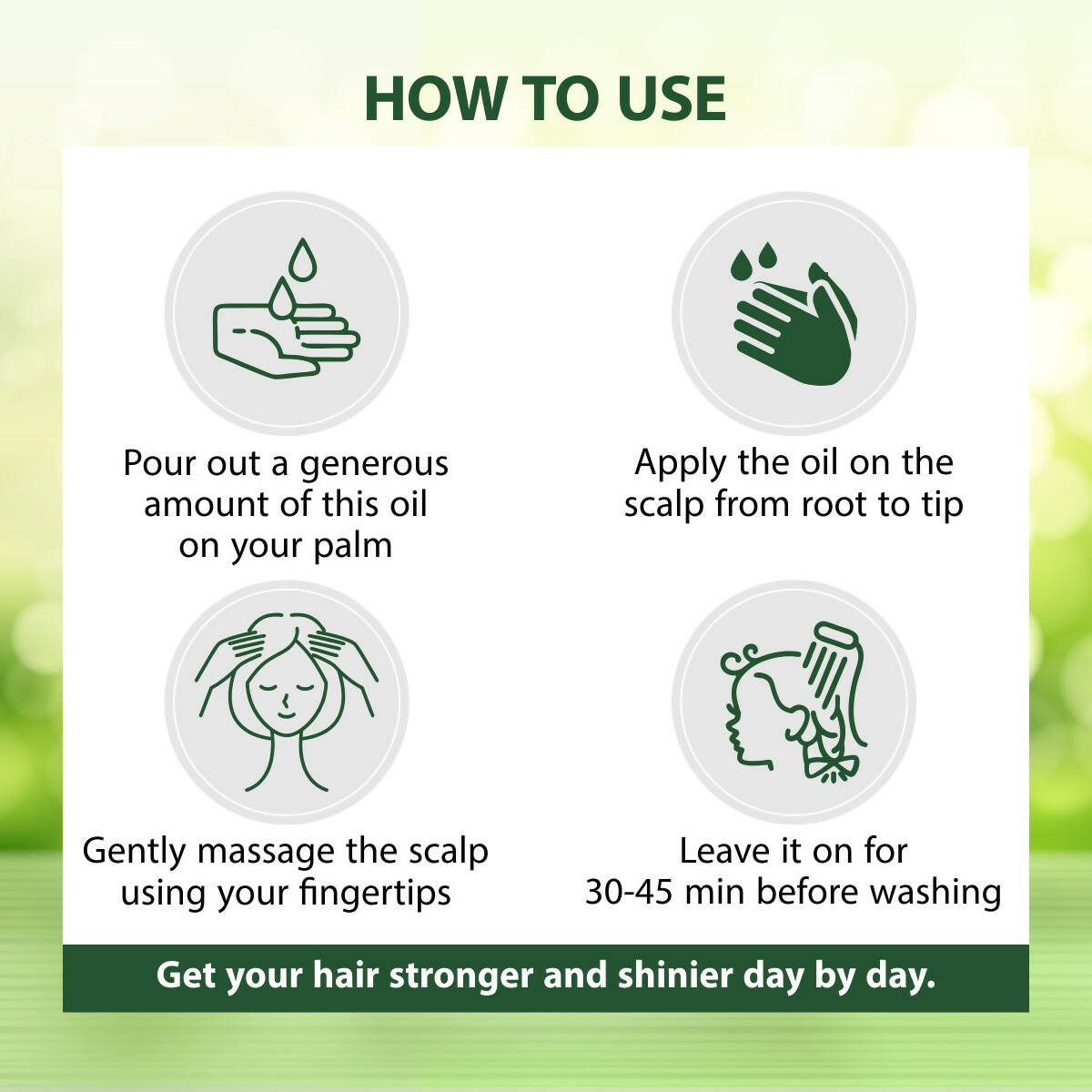 - Massage a suitable amount of the oil from root to tip using gentle circular motions with your fingertips.