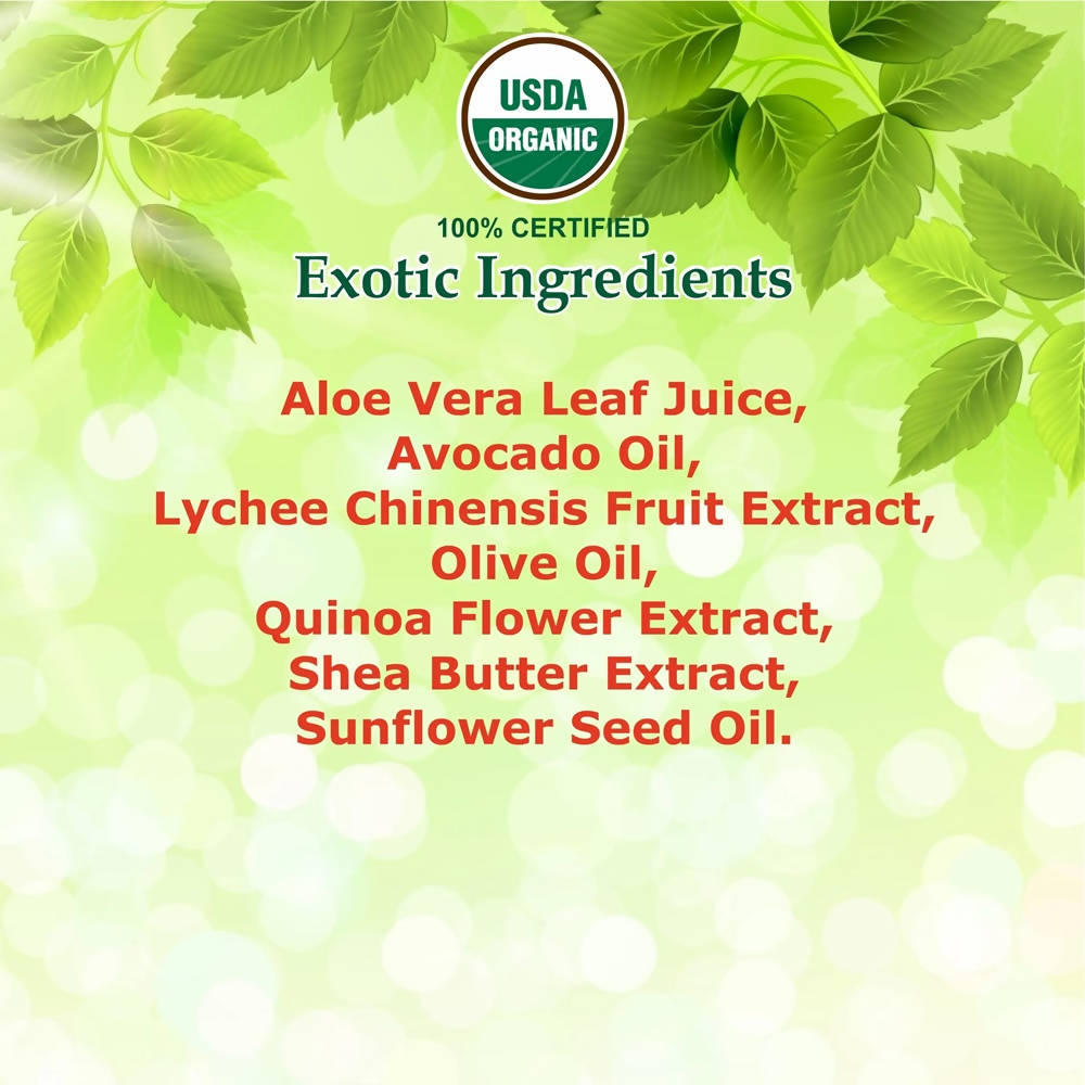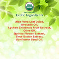 Ingredients:- Aloe Vera Leaf Juice, Avocado Oil, Lychee Chinensis Fruit Extract, Olive Oil, Quinoa Flower Extract, Shea Butter Extract, Sunflower Seed Oil.