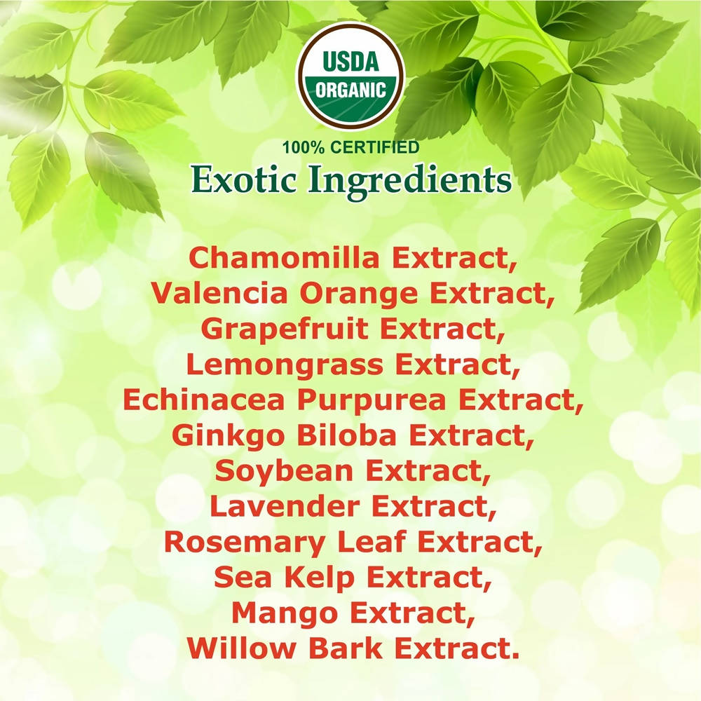 Ingredients:- Chamomilla Extract, Valencia Orange Extract, Grapefruit Extract, Lemongrass Extract, Echinacea Purpurea Extract, Ginkgo Biloba Extract, Soybean Extract, Lavender Extract, Rosemary Leaf Extract, Sea Kelp Extract, Mango Extract, Willow Bark Extract.