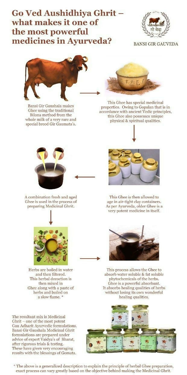 - This blend also incorporates 'Purana Ghrit', renowned in Ayurveda for its distinctive healing properties, along with Ghee from a particularly special Gir Gaumata breed.