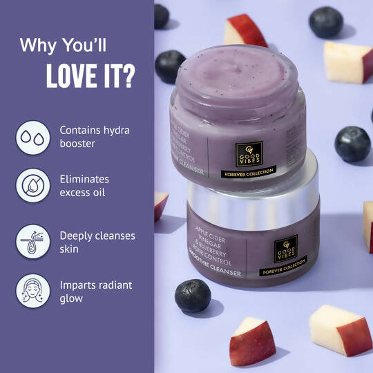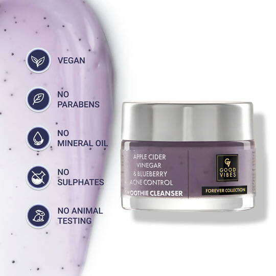 - Effortless, purifying, and incredibly refreshing! Once your skin experiences our Good Vibes Acne Control Smoothie Cleanser, there's no turning back. Delightfully setting the stage for clear skin, the fusion of Apple Cider Vinegar and Blueberry provides a radiant cleanse. It effectively removes oily residues, dirt, and impurities, making acne concerns seem like a Atirucartnt memory. Simply pump, swirl, and rinse—this smoothie cleanser stands as a premier natural remedy for acne.