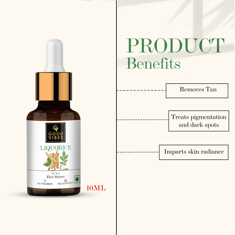 Provide your skin with an effective de-tan solution using the Good Vibes Liquorice De-Tan Serum! Enriched with Liquorice, it accelerates the skin's healing by inhibiting melanin production, thus evening out skin tone. Its anti-inflammatory properties help decrease redness or irritation. The serum aids in tan removal, combats dullness, and protects against UV ray damage. It also supports the regeneration of elastin and collagen, contributing to smoother skin. By fading discoloration and dark spots, it brightens your complexion with every application, leaving your skin looking bright, glowing, and radiant!