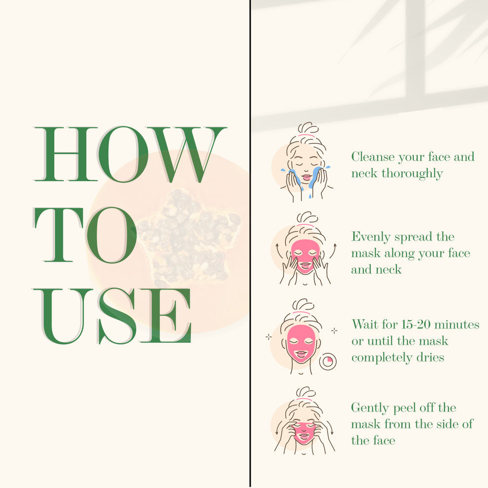 The Papaya ingredient in the formulation contributes its acclaimed skin-brightening qualities. Packed with an array of nutrients, antioxidants, and vital vitamins, along with the diligent enzyme Papain, this peel-off mask sheds dead skin cells and counteracts free radicals, leaving the skin exfoliated and purified. It also reduces pigmentation, addresses blemishes, diminishes dark spots, and balances skin tone, ultimately providing you with smooth, impeccable skin. Step out with radiant, youthful-looking skin and let the world admire your beauty and your positive vibes!