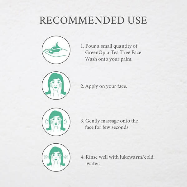 Utilize a generous amount of GreenOpia Tea Tree Face Wash and gently massage using a circular upward motion. Allow a few seconds before rinsing completely. For optimal results, incorporate into your daily routine.