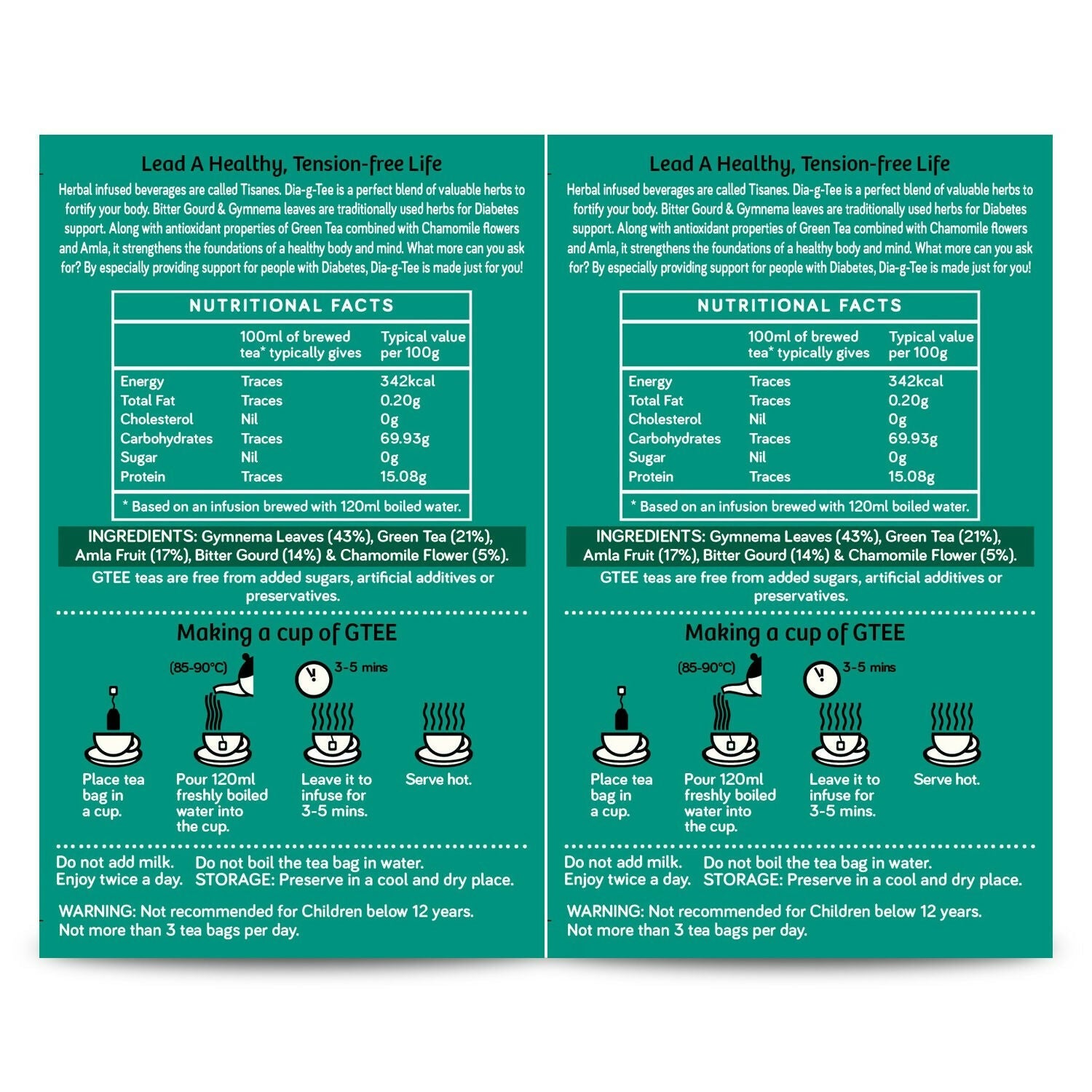 Gtee DIA-g-TEE Diabetic Friendly Tea contains a blend of bitter gourd, gymnema leaves, green tea, amla fruit, and chamomile flower. This tea is free from added sugars, colorants, artificial additives, and preservatives.