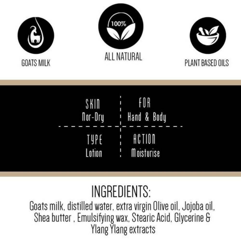 - Goats Milk, Jojoba Oil, Apricot Kernel oil, 100% Natural emulsifiers, Glycerine, Aloe vera, and Natural Preservatives.