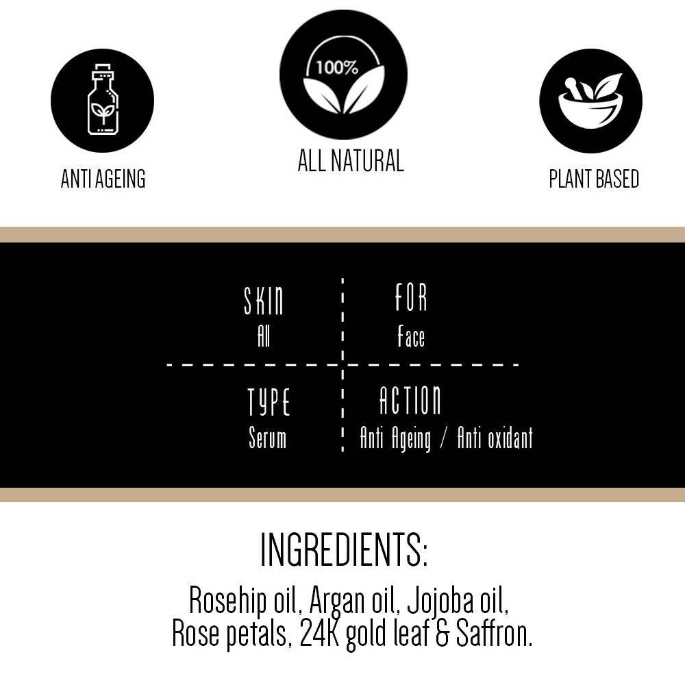 - Enhance your beauty routine with the opulent touch of Goddess facial oil. Enriched with 24K Gold, Saffron, and Rose petals, it intensely nourishes, conditions, and shields your skin, leaving it with a lustrous, velvety finish. This formulation seals in hydration, offering anti-aging advantages while rejuvenating your skin’s radiant softness, suppleness, and comfort.