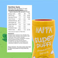 - Happa Super Puffs offer the ideal snack for your little one! These delightful treats are available in a range of scrumptious flavors such as banana, strawberry, and blueberry. Crafted with natural ingredients, they are designed by a devoted dad aiming for the best for his child. These puffs are not only tasty but also packed with nutrients. They are easy for small hands to grasp, fostering fine motor skill development, and are an excellent choice for teething babies due to their melt-in-the-mouth texture, which makes them simple for the baby to eat. Like all Happa offerings, these super puffs are devoid of artificial preservatives and colors. If you're seeking a flavorful, nutritious, and easy-to-handle snack for your baby, Happa Super Puffs are the perfect choice! Enjoy them yourself too! We provide a diverse range of flavors to offer your baby variety.