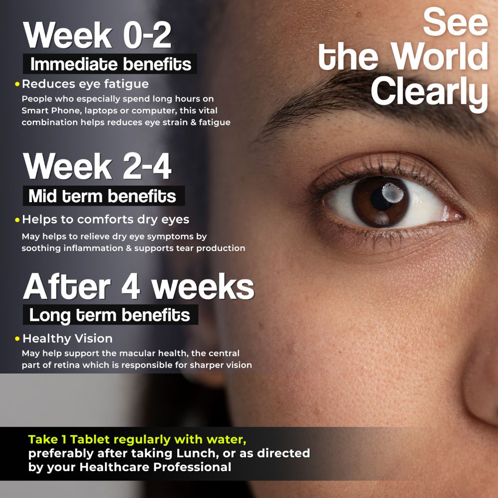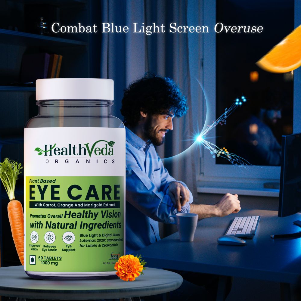 Health Veda Organics Plant Based Eye Care Supplement loaded with antioxidants that may help to protect your eyes from free radical damage, may help to restore eye health & support Visual function. This Eye Care supplement is good for both men and women. With the goodness of carrot juice & orange juice extracts, it acts as a complete vision care supplement that restores natural eye health. Health Veda Organics Plant-Based supplement for eyes provides essential nutrition to your eyes while supporting normal retinal function. Daily exposure to digital screens may cause your eye more harm than you can ever imagine! This supplement contains clinically proven ingredients that help relieve eye stress-strain, fatigue & inflammation. It is extremely helpful to get rid of irritation in the eyes, dryness as well as age-related discomforts.